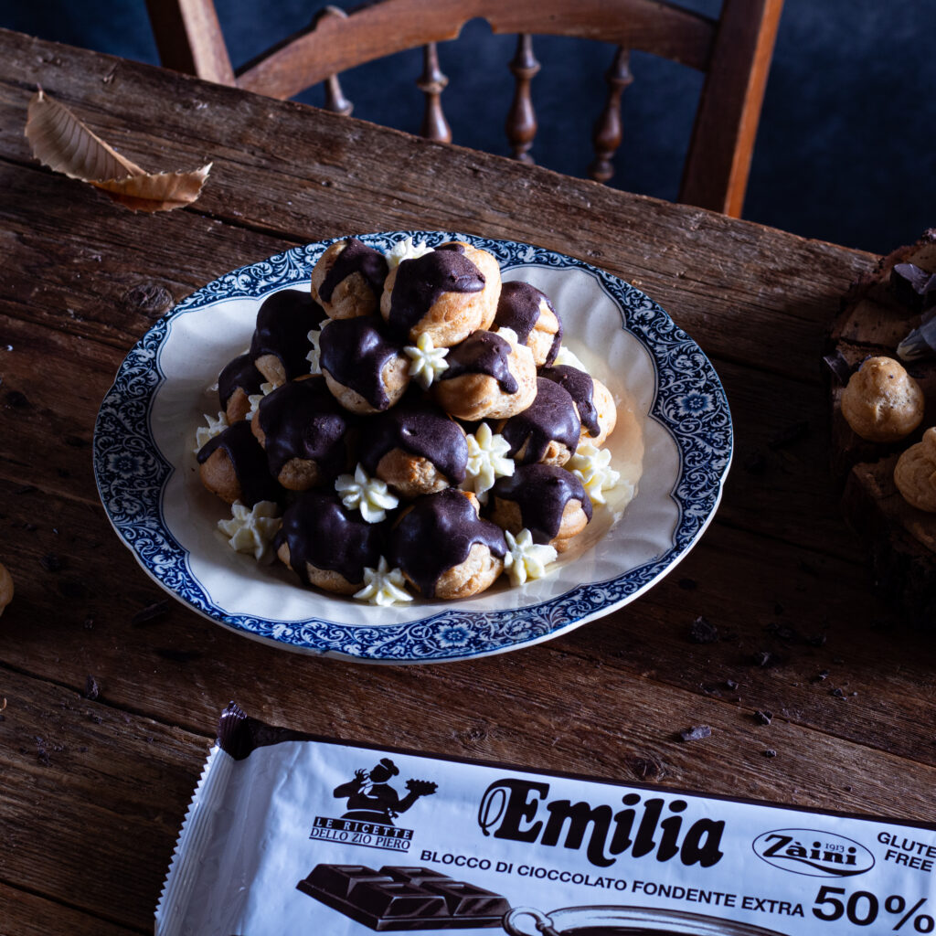 Gli "Choux dei compleanni", piccoli golosi profiteroles di mamma con crema bianca e glassa al cioccolato fondente Zàini... Quando ho scartato il mitico blocco di cioccolato fondente Emilia Zàini.1913 è stato come entrare dentro una macchina del tempo, andare indietro negli anni e ritornare piccola piccola... in cucina con mamma e le mie due sorelle! Era il giorno del mio compleanno, nella mia famiglia abbiamo sempre festeggiato i compleanni! Mia madre non è mai stata una grande pasticcera, ma ha avuto sempre un grande cuore e una presenza costante e amorevole verso noi figlie. Così quando arrivavano i compleanni erano sempre due le alternative per festeggiare, il biancomangiare, che lei preparava con il latte, i biscotti e le ciliegie candite nel mitico stampo di rame, semplice ma bellissimo ai nostri occhi. Oppure, se cadeva di domenica e aveva più tempo e pazienza, gli Choux al cioccolato, piccoli golosi bignè farciti con una crema al latte e glassati da una profumatissima colata di cioccolato fondente, alla fine li posizionava uno ad uno su un grandissimo piatto di ceramica blu, uno sull'altro, decorati da una generosa colata di cioccolato fondente che facevamo a gara a finire a cucchiate perché come sempre ne avanzava un po’ per tutti! Eccoli, dei golosi profiteroles pronti a festeggiare un altro attesissimo compleanno..... Quando mamma scioglieva il cioccolato fondente a bagnomaria era il momento più atteso, il profumo era talmente forte che per giorni fluttuava nell'aria in quella piccola accogliente cucina colorata piena di maioliche siciliane in cui tutto avveniva, pranzi, cene, feste di compleanno...e grandi abbracci. Mi sono detta, perché non li ho mai più preparati? E così quando Zàini mi ha chiesto la mia "ricetta al cioccolato" legata al mio vissuto non ho avuto dubbi, gli choux al cioccolato di mamma sono sicuramente il dolce più evocativo della mia amata infanzia, che ha per me un valore simbolico così forte da entrare in un ricettario collettivo fatto di ricordi, di passioni, di cucina evocativa...di buon cioccolato! Grazie Zàini per questa opportunità e per aver rispolverato emozioni così forti un po’ dimenticate... questa volta mamma gli "choux al cioccolato te li ho preparati io", anche se non è il tuo compleanno! @storie di cioccolato @SCACCIAPENSIERI_BLOG